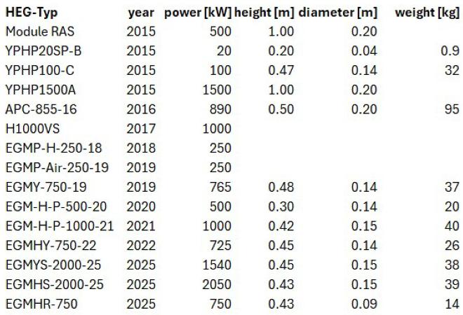 Website of the German company Sinag Deutschland: https://sinag.energy . That website is in German, however via the globe symbol at the bottom on the right a translating program allows a translation into several languages but the available pdf files are not translated. The German company Sinag Deutschland offers 1 MW generators (400 V AC, 50 Hz or 480 V AC, 60 Hz) and the specified delivery time is currently 6 months (September 2025). They are modularly scalable up to 400 MW. An English-language technical data sheet of the 1 MW generator can be downloaded from this website (as of July 2025): https://novam-research.com/resources/Sinag-1MW-generator-EER-SPG_Technical-data-sheet_July-2025.pdf . Therein the specified dimensions and weight of an EER-SPG are 6,8 x 2,8 x 1,2 m and 12600 kg, respectively. Meanwhile, however, the 1 MW generators have a new design with a smaller set-up area and a smaller weight, namely about 5 square meter and about 6000 kg.